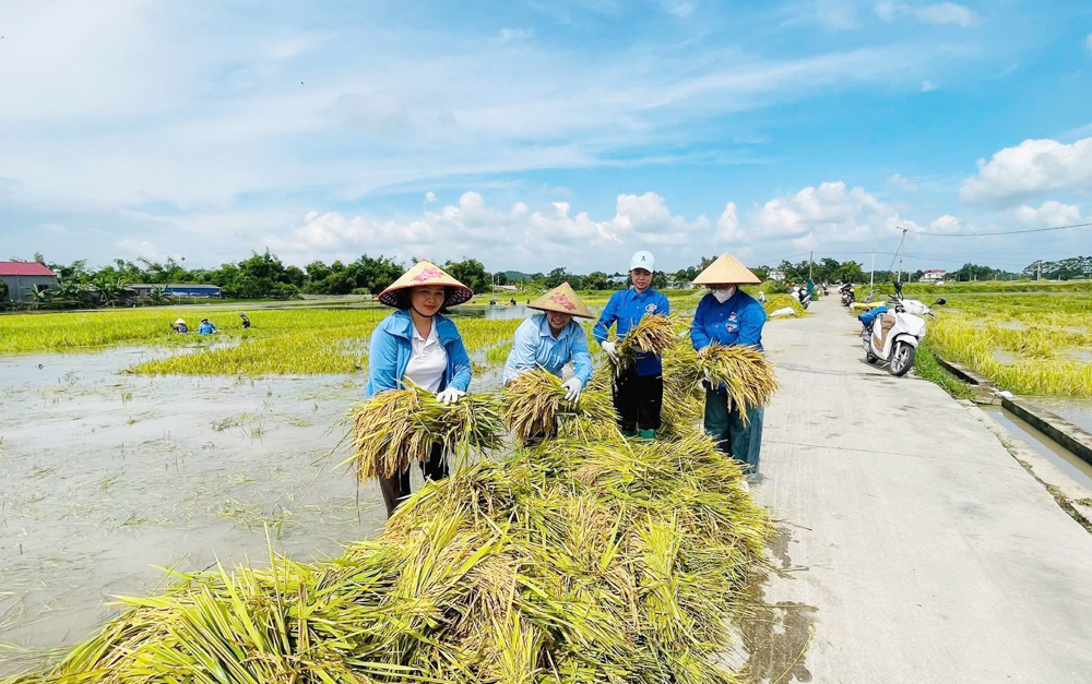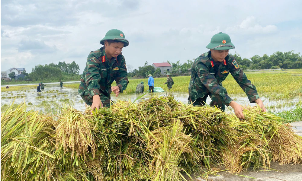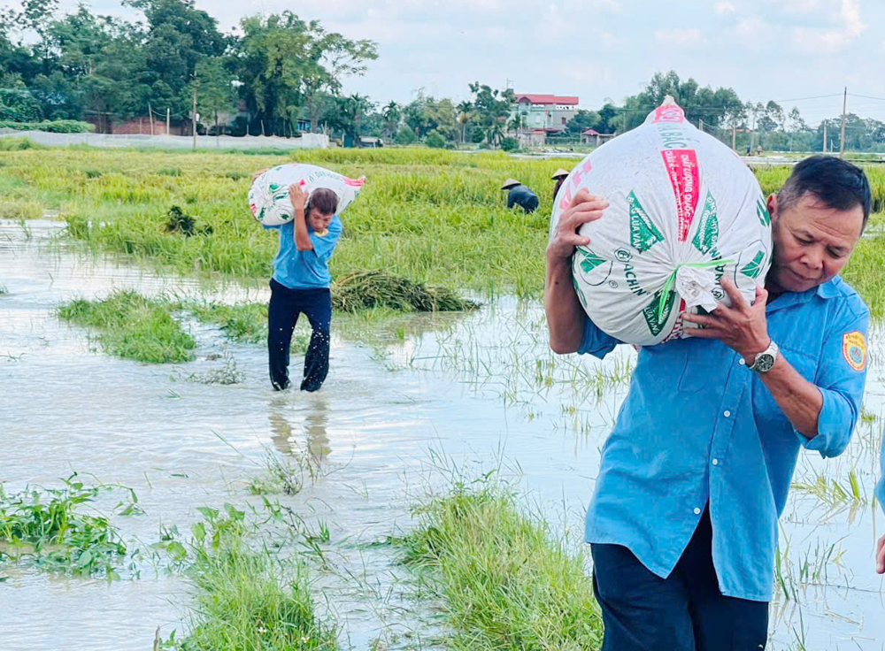 Trên những thửa ruộng còn ngập nước, không khí lao động diễn ra khẩn trương. Các lực lượng cùng người dân gặt lúa, vận chuyển về nơi tập kết an toàn. Tiếng máy gặt xen lẫn tiếng cười nói, động viên nhau tạo nên bầu không khí đoàn kết, quyết tâm hoàn thành sớm việc thu hoạch lúa mùa.
