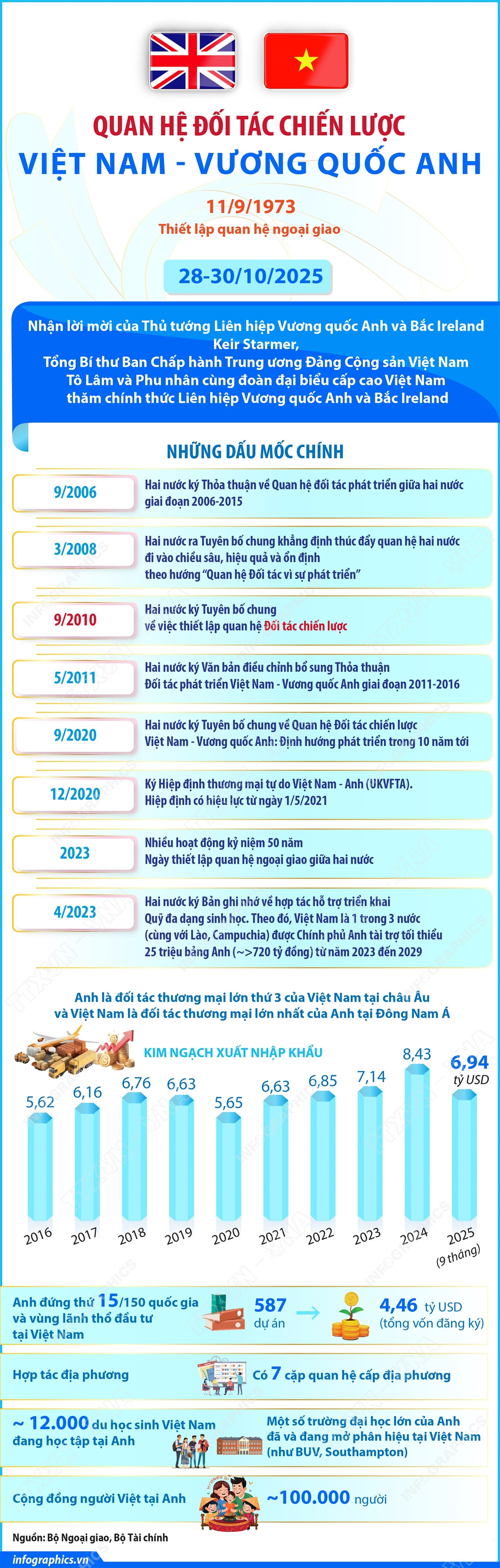 Nhận lời mời của Thủ tướng Liên hiệp Vương quốc Anh và Bắc Ireland Keir Starmer, Tổng Bí thư Tô Lâm và Phu nhân cùng đoàn đại biểu cấp cao Việt Nam thăm chính thức Liên hiệp Vương quốc Anh và Bắc Ireland từ ngày 28 đến 30/10/2025.