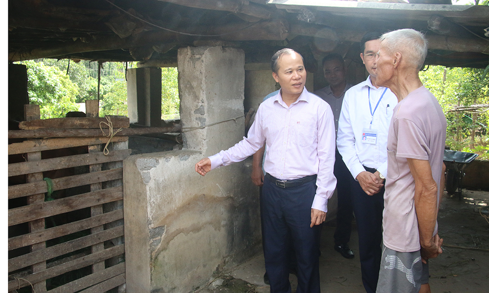 Đồng chí Mai Sơn thăm một gia đình được hỗ trợ bò giống tại thôn Ao Sẻ, xã Vô Tranh. |