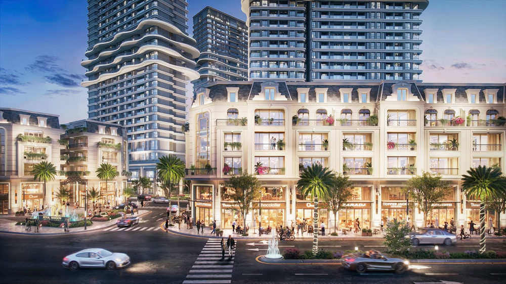 Điểm nhấn nổi bật của Royal Mansion là 171 căn thương mại, mỗi căn là một kiệt tác kỳ công với 5 tầng 1 tum, được thực hiện bởi trình độ xây dựng tinh xảo và tiêu chuẩn bàn giao tương đương với các dinh thự triệu đô, đắt giá củaViệt Nam. Mặt tiền mỗi căn đều được ốp đá Moca Limestone nhập khẩu từ Bồ Đào Nha, mái lợp ngói Secoin kiểu Pháp, sơn hiệu ứng đá 7 lớp công nghệ Nhật Bản bền vững với thời gian, an toàn cho sức khoẻ, chống thấm hiệu quả. Hệ thống khung nhôm cửa đi, cửa sổ được sản xuất từ nhôm định hình tiêu chuẩn Châu Âu, hệ thống kính Low-E 2 lớp bạc dày 19mm chống tia cực tím UV cách âm cách nhiệt tối đa… kết hợp cùng sắc màu hiện đại của hệ thống đèn hắt sáng dọc thân căn hộ thương mại làm nổi bật từng vật liệu hoàn thiện cao cấp. Đặc biệt, 100% căn thương mại sở hữu ít nhất 02 mặt tiền, mang đến cho gia chủ một không gian sống đầy đủ tiện nghi, riêng tư, biệt lập và cơ hội kinh doanh thông minh, sinh lời vượt trội.