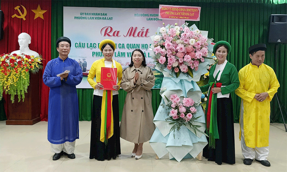Đại diện lãnh đạo phường Lâm Viên - Đà Lạt trao quyết định thành lập CLB và tặng hoa chúc mừng. |