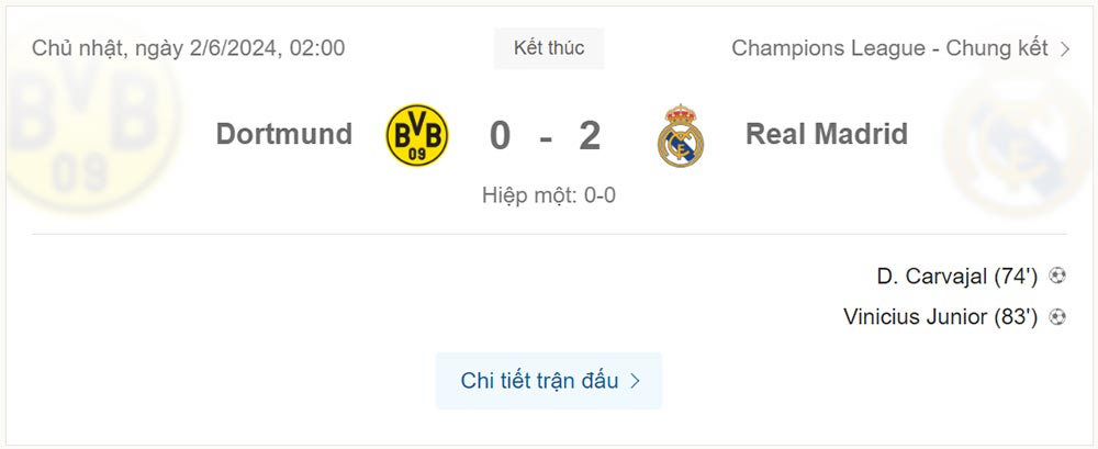 Real đã toàn thắng chín trận chung kết Champions League gần nhất, dù hầu hết trong số đó diễn ra không dễ dàng với đội. Lần này kịch bản trận đấu khá giống năm 2022 - thời điểm Liverpool phung phí cơ hội để rồi phải trả giá trong hiệp hai trước Real. Dortmund không rút ra được bài học từ Liverpool, vẫn bỏ lỡ loạt cơ hội tốt trong thế lấn lướt.