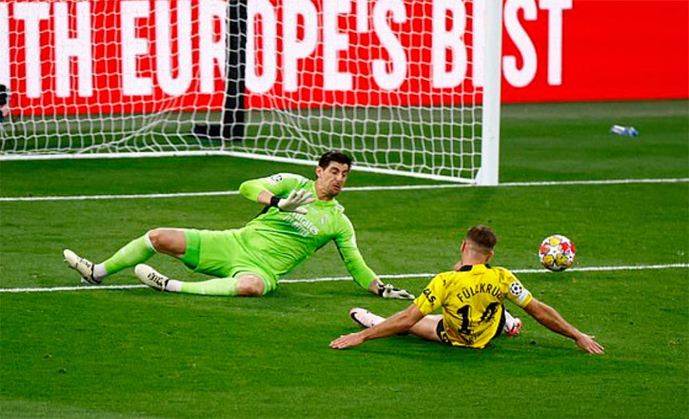 Hai tình huống ngon ăn nhất đến với CLB Đức trong vòng hai phút giữa hiệp một. Phút 21, trung vệ Mats Hummels nhận bóng ở phần sân nhà, chuyền sệt chọc khe dọn cỗ cho Karim Adeyemi lao xuống đối mặt thủ môn Courtois. Tiền đạo chạy nhanh nhất Bundesliga không sút, mà rê bóng nhưng để văng quá xa, làm hẹp góc sút khiến cơ hội trôi qua. Sau đó, đến lượt hậu vệ trái Ian Maatsen chọc khe cho trung phong Niclas Fullkrug lao xuống sút chìm chéo góc nhưng dội cột dọc bật ra. Trọng tài không căng cờ, nhưng dường như Fullkrug đã việt vị.