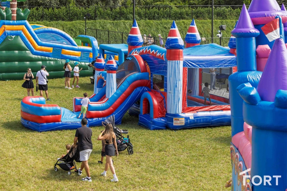 Tại The Fort, trẻ em có nhiều hoạt động thú vị khi đi cùng bố mẹ đến tổ hợp sân pickleball. Khu phức hợp này cung cấp nhiều lựa chọn vui chơi cho các gia đình, bao gồm cả các chương trình tập trung vào trẻ em và khu vực giải trí ngoài trời. Trong ảnh là nhà phao, nơi trẻ em có thể thỏa sức nhảy múa, cười đùa và đốt cháy năng lượng.