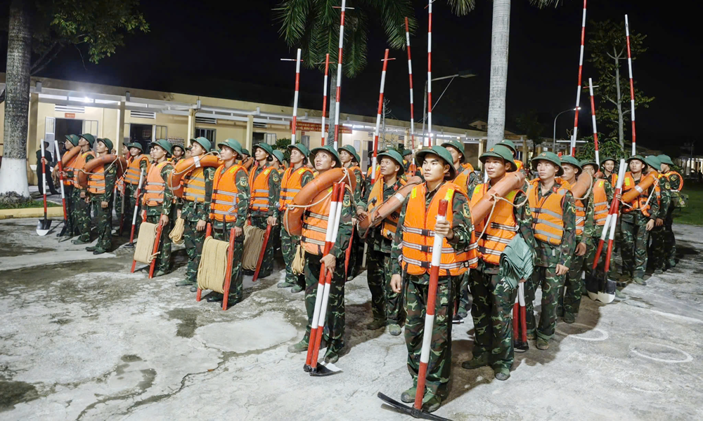 Cán bộ, chiến sĩ Trung đoàn 141, Sư đoàn 3 (Quân khu 1) lên đường giúp Nhân dân xã Hợp Thịnh (Bắc Ninh) phòng, chống mưa lũ. |