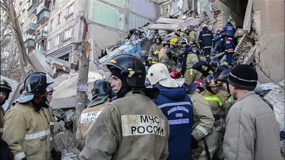 Lực lượng cứu hộ bới đống đổ nát tại nơi chung cư bị sập để tìm các nạn nhân. |
