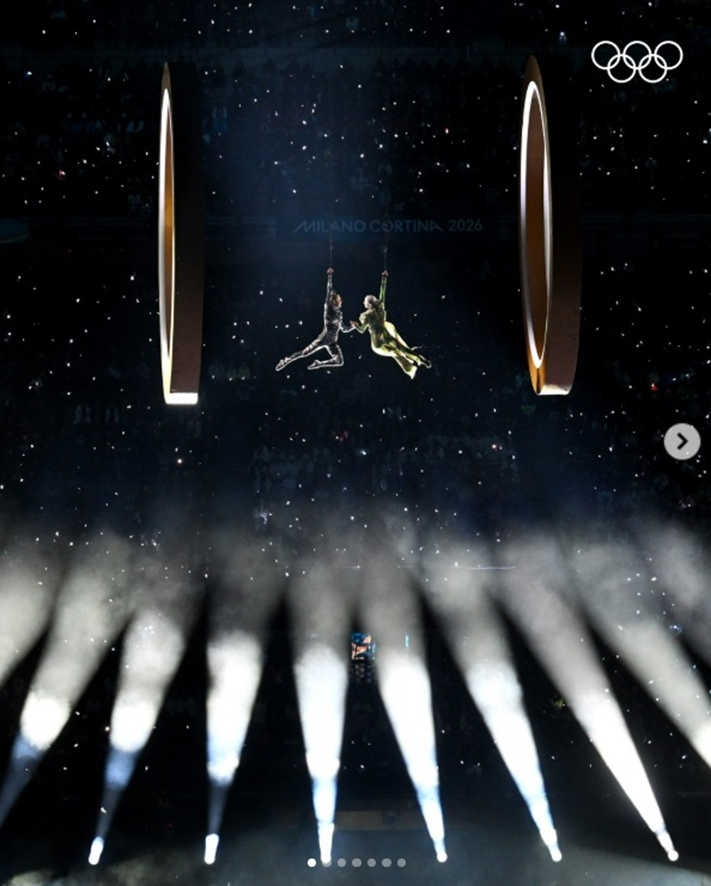 Tại sân vận động San Siro ở Milan, những chiếc đầu búp bê khổng lồ của các nhà soạn nhạc nổi tiếng Ý chạy vòng quanh sân. Những ống sơn khổng lồ treo trên cao "đổ" xuống các vũ công đầy màu sắc, khiến khán giả có cảm giác như đang được chào đón vào thành phố Oz. Đó là hình ảnh trong lễ khai mạc Thế vận hội mùa Đông Milano Cortina 2026.