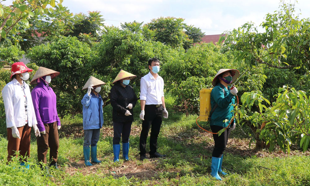 Lao động xã Giáo Liêm thực hành kỹ năng sử dụng thuốc bảo vệ thực vật đúng cách trên cây vải thiều. |