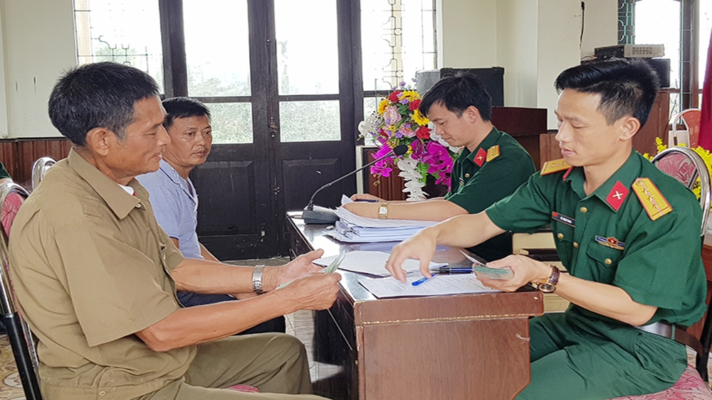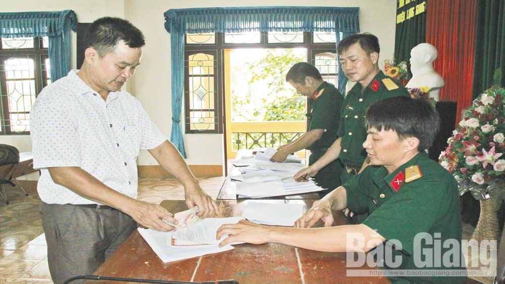 Cán bộ Ban CHQS huyện Tân Yên chi trả chế độ cho các đối tượng. |