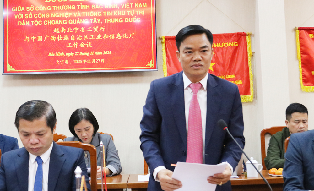 Phát biểu chào mừng Đoàn công tác, đồng chí Nguyễn Minh Hiếu, Giám đốc Sở Công Thương nhấn mạnh, Bắc Ninh hiện là trung tâm công nghiệp công nghệ cao của Việt Nam, với hệ sinh thái sản xuất điện tử - bán dẫn - lắp ráp thiết bị thông minh phát triển mạnh mẽ. Các tập đoàn hàng đầu như Samsung, Canon, Foxconn, Goertek, Amkor… đã đặt trung tâm sản xuất lớn tại Bắc Ninh, tạo nền tảng vững chắc cho công nghiệp hỗ trợ và chuỗi cung ứng công nghệ cao.