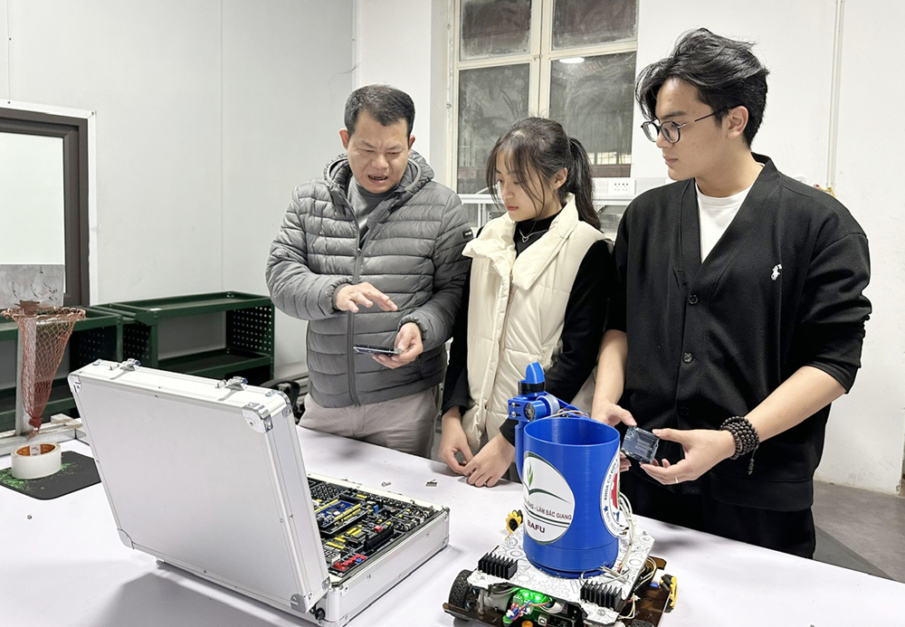 Giáo viên hướng dẫn nhóm sinh viên Trường Đại học Nông - Lâm Bắc Giang thực hiện dự án “Nghiên cứu ứng dụng Robot trong ném bóng tự động”. |