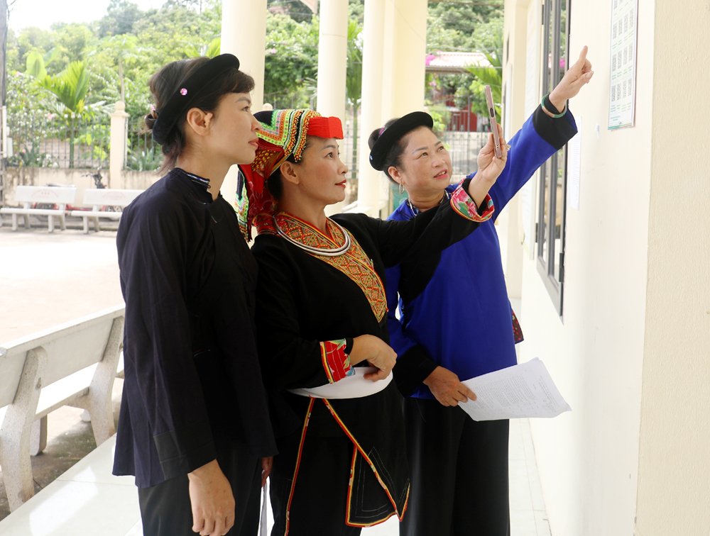 Hội viên phụ nữ DTTS xã Hồng Kỳ (Yên Thế) trao đổi về công tác ứng dụng chuyển đổi số trong sinh hoạt hội. |