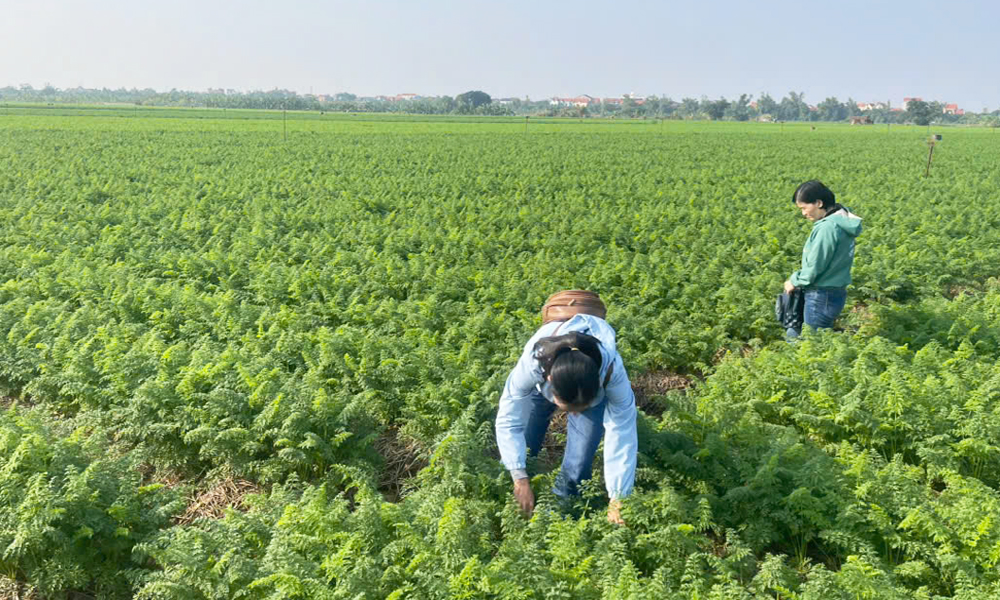 Cán bộ Chi cục Trồng trọt và Bảo vệ thực vật điều tra tỷ lệ chuột hại tại cánh đồng trồng cà rốt xã Lương Tài. |