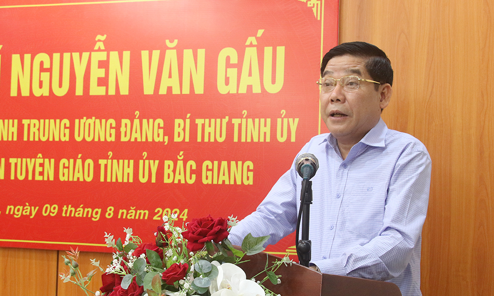 BẮC GIANG - Sáng 9/8, đồng chí Nguyễn Văn Gấu, Ủy viên T.Ư Đảng, Bí thư Tỉnh ủy Bắc Giang làm việc với Ban Tuyên giáo Tỉnh ủy về kết quả triển khai thực hiện các nhiệm vụ về công tác tuyên giáo, bảo vệ nền tảng tư tưởng của Đảng trong Đảng bộ tỉnh từ đầu nhiệm kỳ đến nay; những định hướng lớn về công tác tuyên truyền từ nay đến Đại hội đại biểu Đảng bộ tỉnh lần thứ XX.