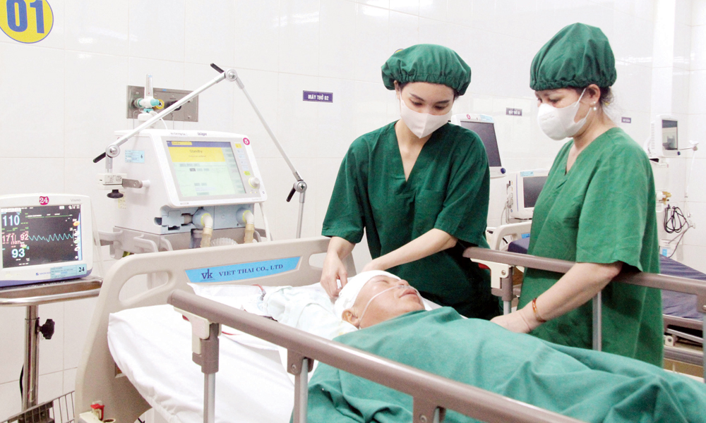 Điều dưỡng Nguyễn Thị La (trái) cùng đồng nghiệp chăm sóc bệnh nhân vừa mổ chấn thương sọ não. |