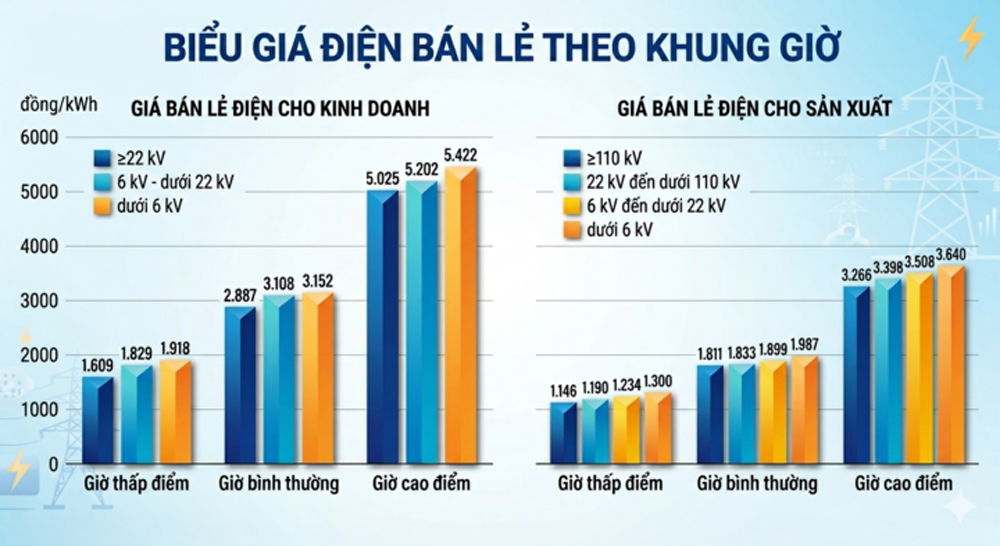 Theo Quyết định số 1279/QĐ-BCT ngày 9/5/2025 của Bộ Công Thương, biểu giá điện bán lẻ theo các khung giờ cao điểm, thấp điểm và giờ bình thường được áp dụng cho khách hàng là các ngành sản xuất và khách hàng sử dụng điện cho kinh doanh. Giá điện các khung giờ cũng phụ thuộc vào từng cấp điện áp.