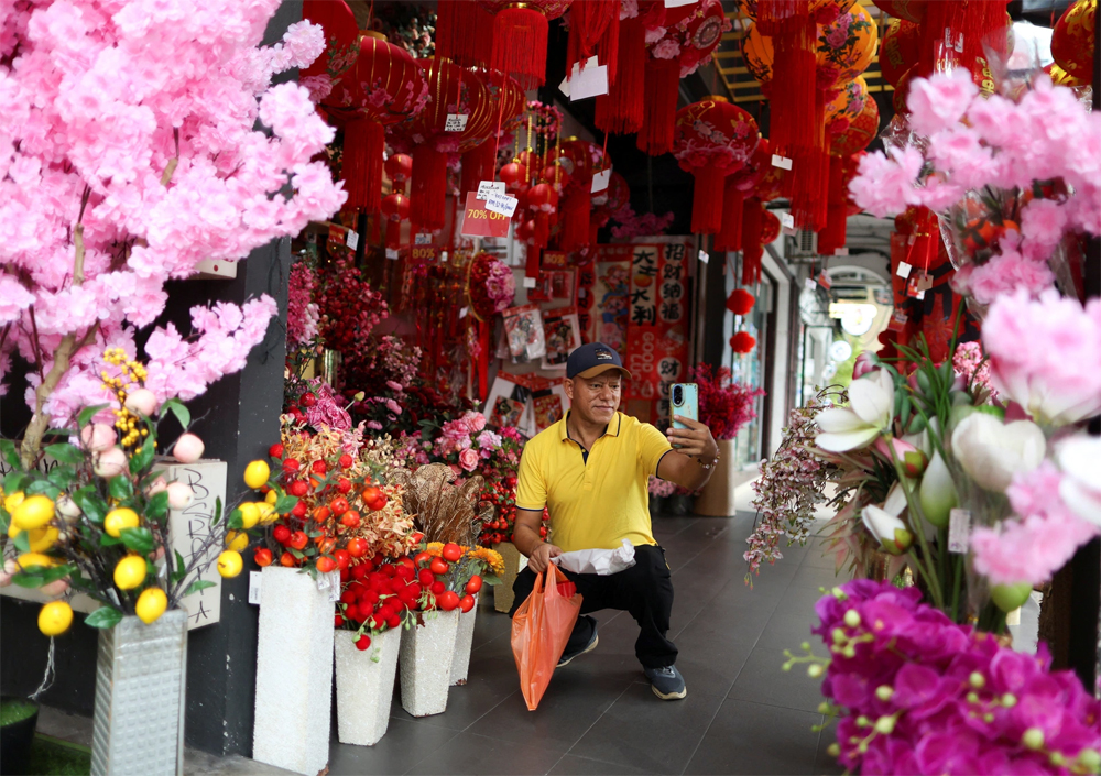 Một người đàn ông chụp ảnh "tự sướng" với đồ trang trí Tết Nguyên đán tại một cửa hàng ở Kuala Lumpur, Malaysia.