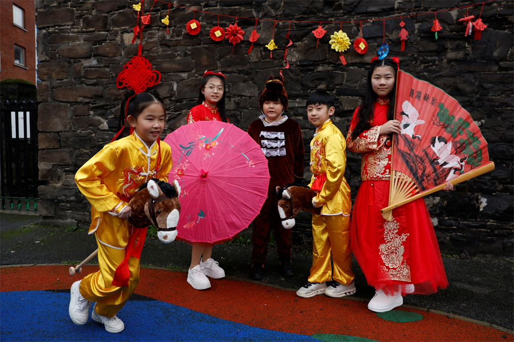 Nhóm em nhỏ mặc trang phục chào đón Tết Nguyên đán tại Dublin, Ireland.