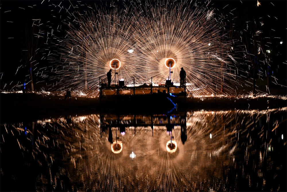 Màn biểu diễn "pháo hoa" bằng sắt nóng chảy trong một công viên ở Bắc Kinh, Trung Quốc.