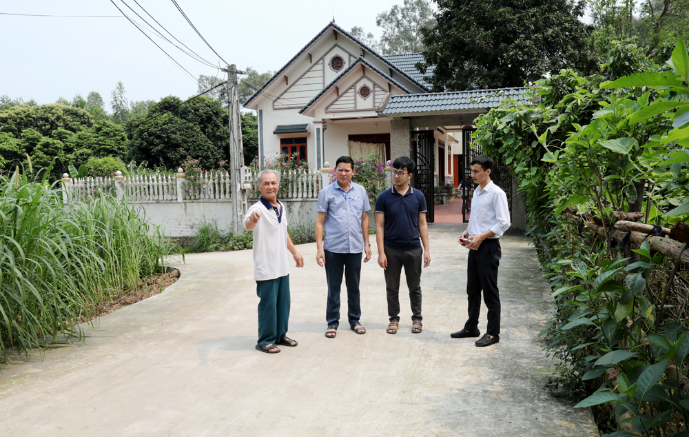 Ông Đỗ Bá Thanh (ngoài cùng bên trái), thôn Kè, xã Minh Đức giới thiệu về tuyến đường mới mở do gia đình ông hiến đất xây dựng. |