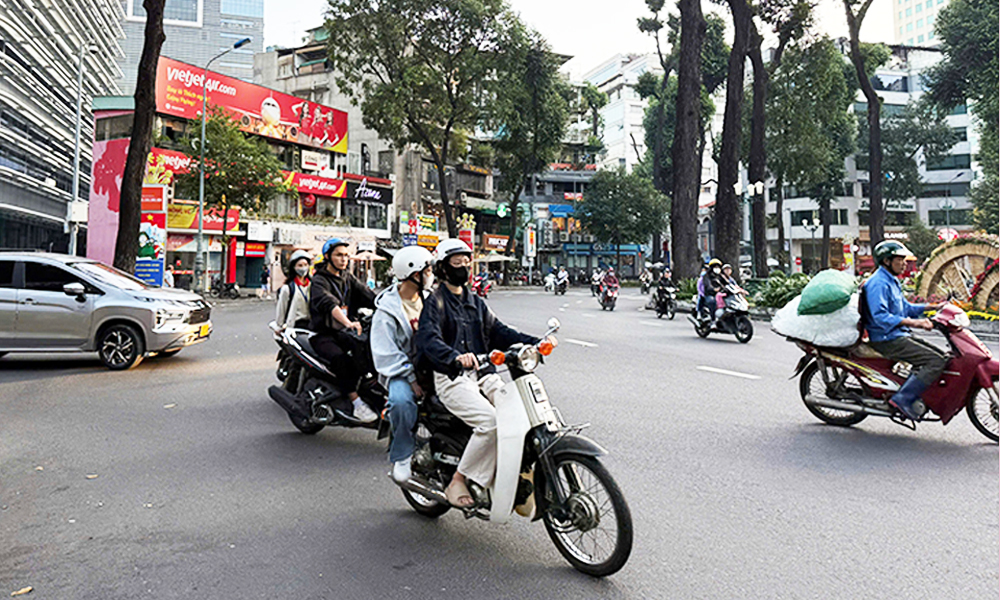 Người dân mặc áo ấm lưu thông khu vực trung tâm Thành phố Hồ Chí Minh. |