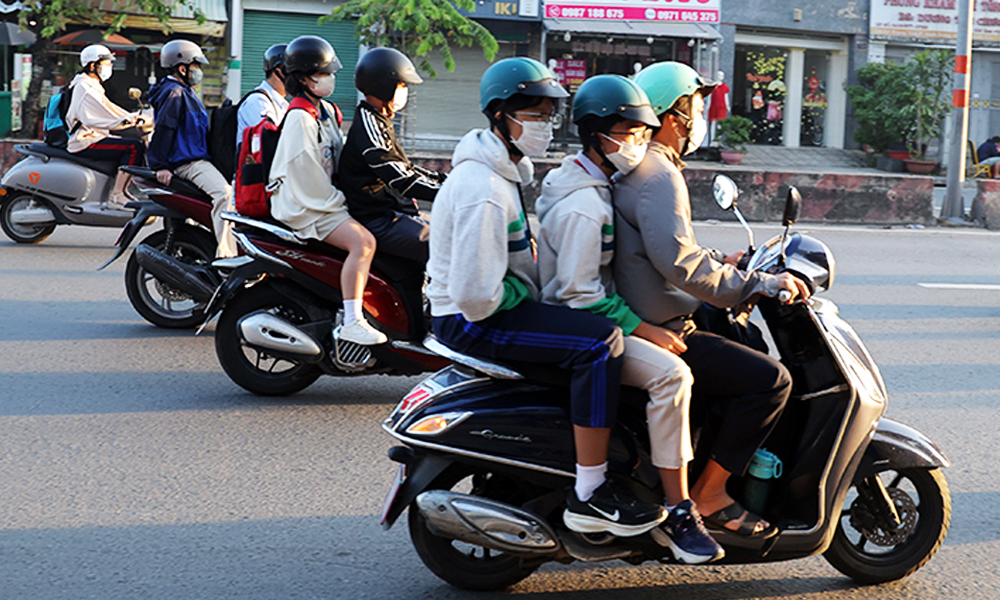 Người dân chở con đi học vào sáng sớm phải mặc áo ấm. |