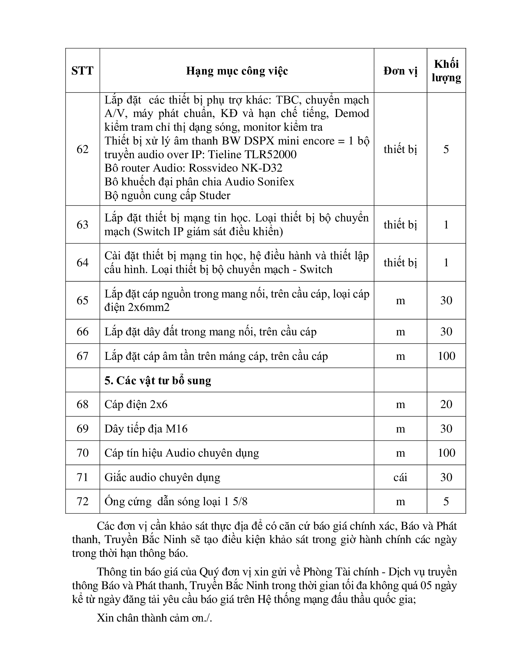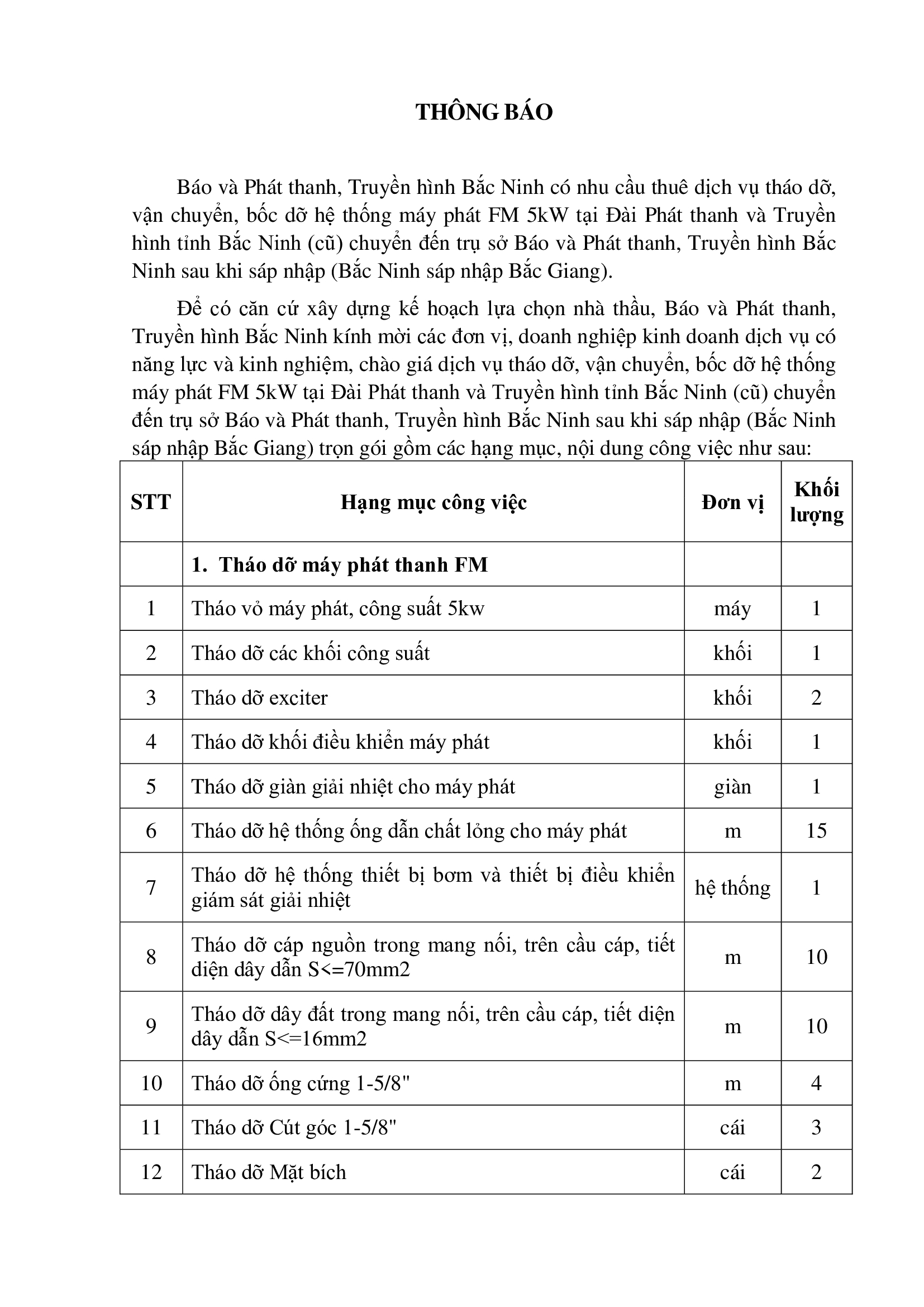 Thông báo chào giá dịch vụ tháo dỡ, vận chuyển, bốc dỡ hệ thống máy phát FM 5kW tại Đài PTTH Bắc Ninh (cũ) chuyển đến trụ sở Báo và Phát thanh, Truyền hình Bắc Ninh sau khi sáp nhập