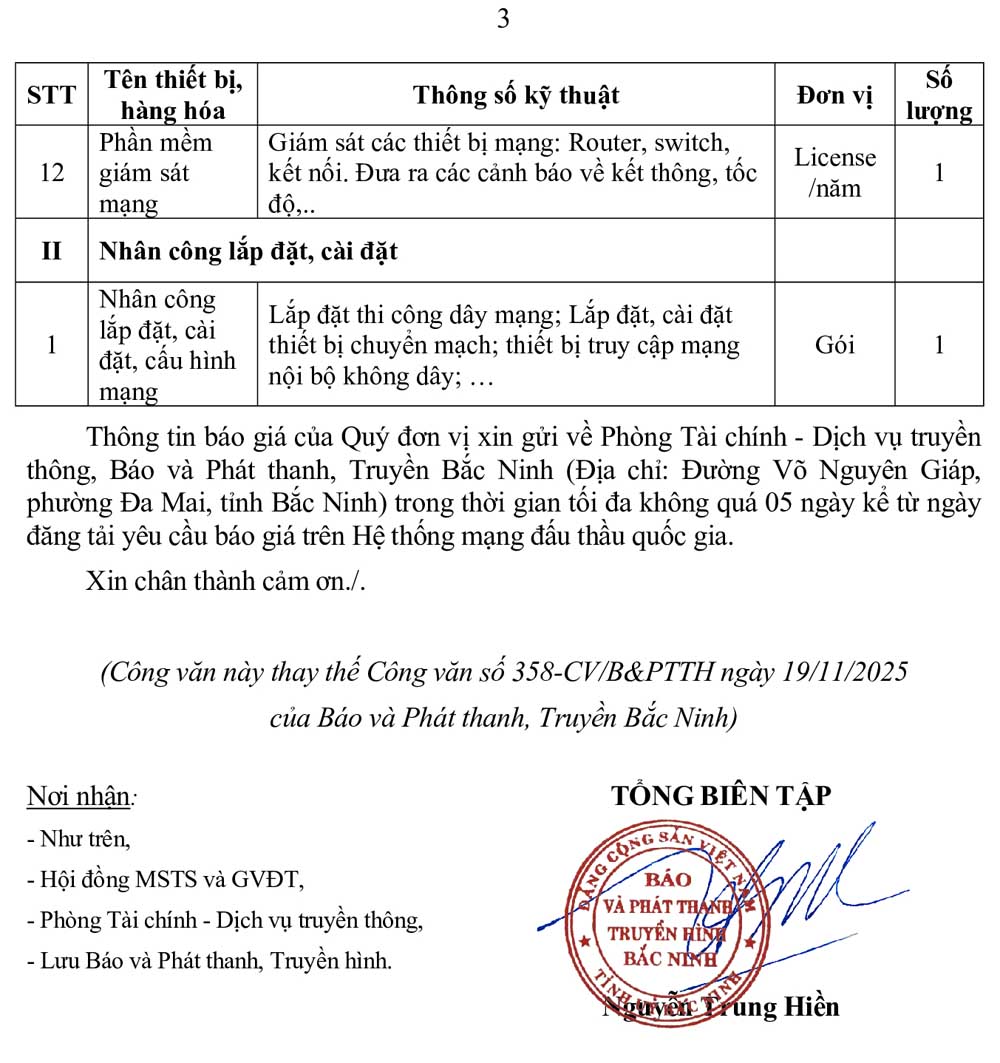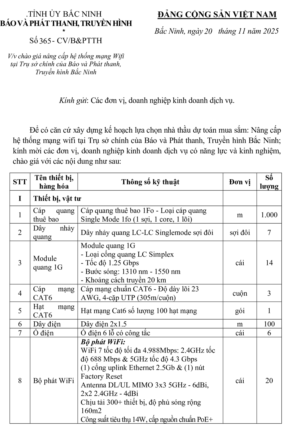 Thông báo chào giá nâng cấp hệ thống mạng Wifi tại Trụ sở chính của Báo và Phát thanh, truyền hình Bắc Ninh