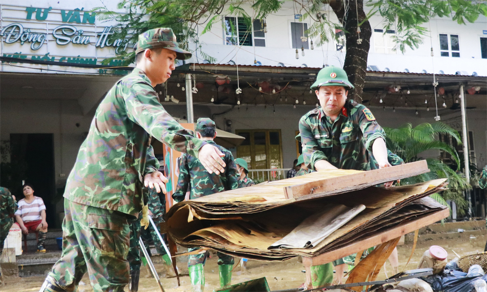 Lực lượng bộ đội hỗ trợ người dân phường Yên Bái ( Lào Cai) dọn dẹp đồ dùng. |