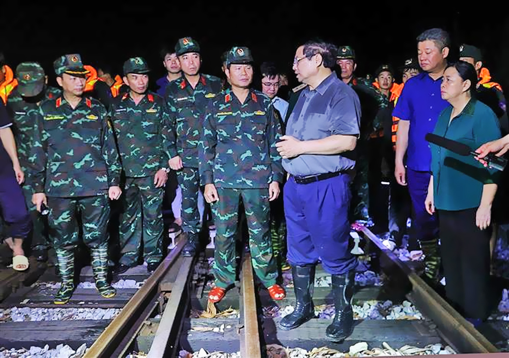 Đến động viên các lực lượng đang làm nhiệm vụ hộ đê trong đêm, Thủ tướng cảm ơn các cán bộ, chiến sĩ đã làm xuyên đêm, với tinh thần trách nhiệm cao nhất, khẩn trương nhất; đề nghị các lực lượng phân công nhiệm vụ hợp lý, có cách làm khoa học, hiệu quả nhất, kịp thời phát hiện, ứng phó, khắc phục các sự cố dù nhỏ nhất ngay khi mới xảy ra.