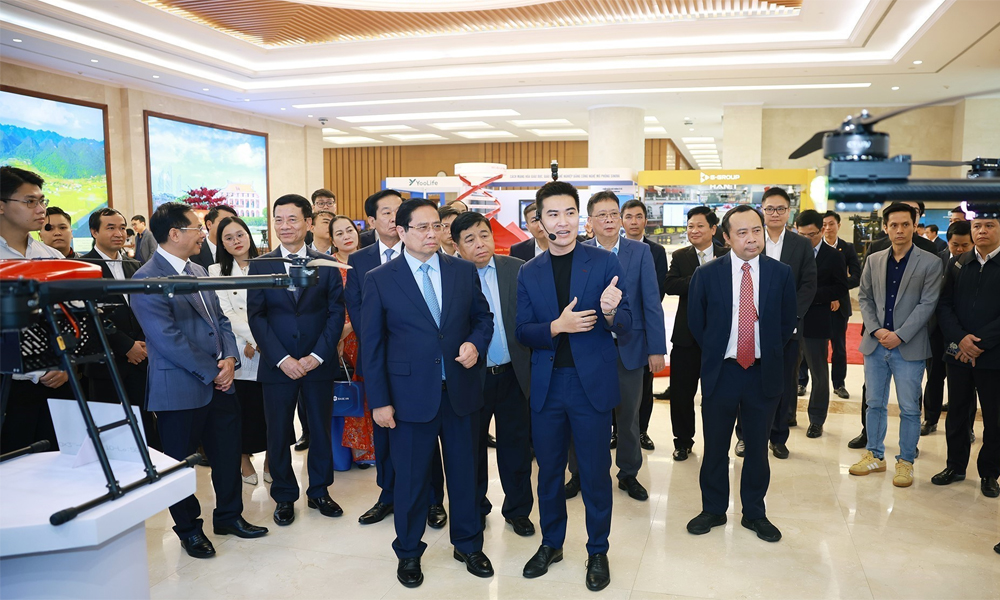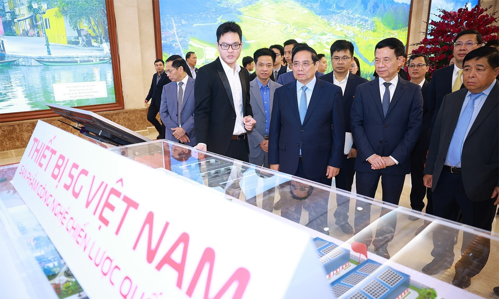 Thủ tướng Phạm Minh Chính tham quan trưng bày sản phẩm công nghệ số. |