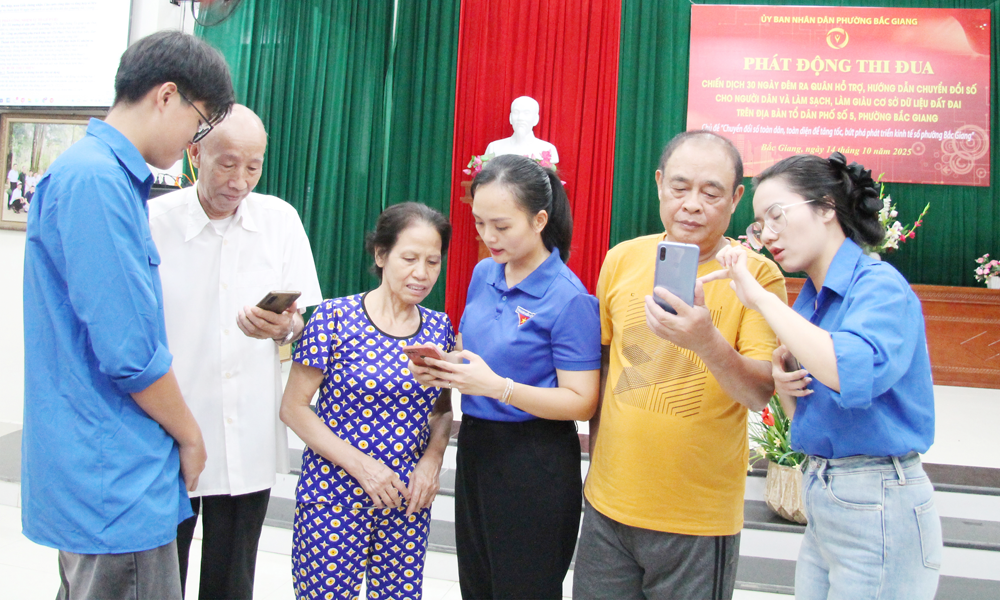 Đoàn viên thanh niên phường Bắc Giang ra quân hỗ trợ, hướng dẫn người dân làm sạch dữ liệu đất đai trên môi trường số. |