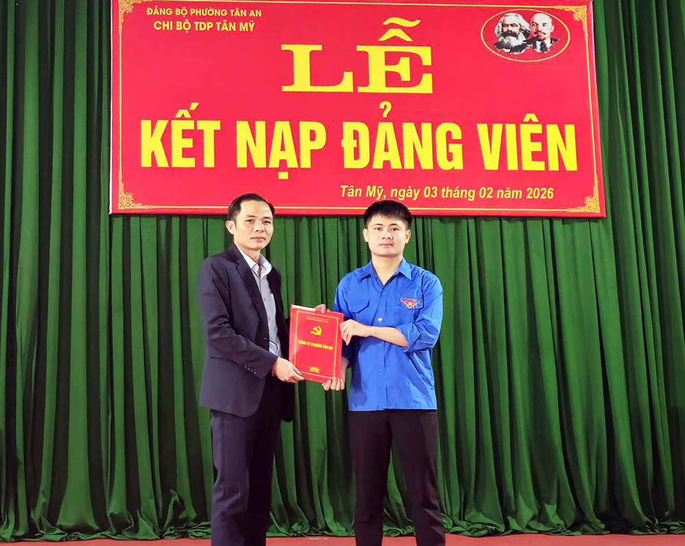 Lãnh đạo Ban Xây dựng Đảng phường Tân An trao quyết định kết nạp cho đảng viên mới của Chi bộ tổ dân phố Tân Mỹ (tháng 2/2026). |