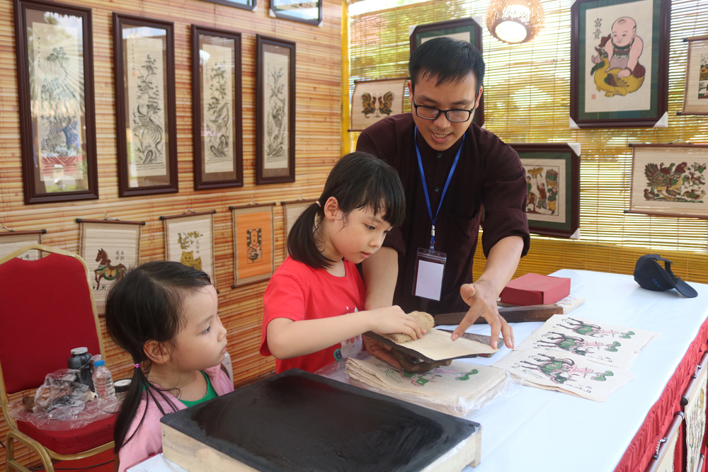 Nghệ nhân trẻ Nguyễn Hữu Đạo hướng dẫn các em nhỏ in tranh Đông Hồ. |
