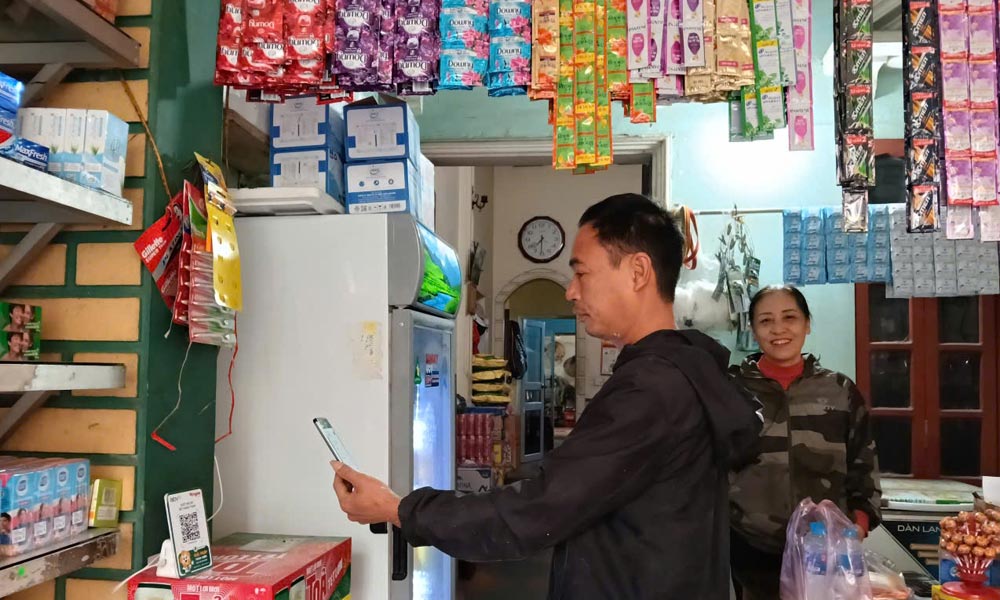 Khách hàng quét mã QR để thanh toán tại cửa hàng tạp hóa Thu Hà. |