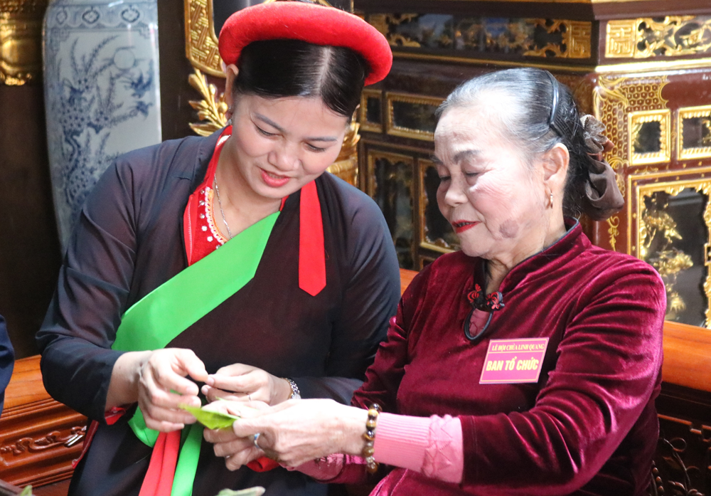 Nghệ nhân Nhân dân Nguyễn Thị Quýnh hướng dẫn liền chị têm trầu |