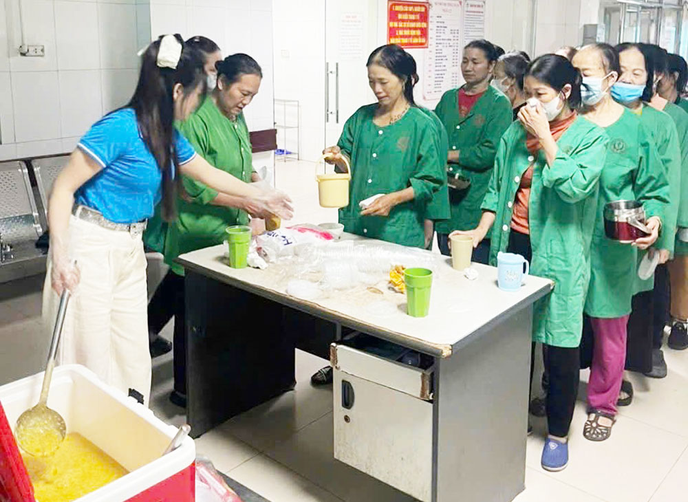Tình nguyện viên Câu lạc bộ thiện nguyện Tâm An phát cháo miễn phí cho bệnh nhân tại Bệnh viện Đa khoa Bắc Ninh số 2. |