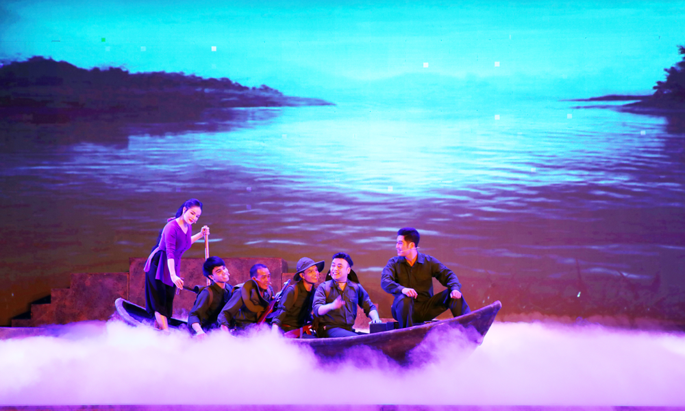 Trong khi đó, vở chèo “Mưa đỏ” (Nhà hát Sân khấu Truyền thống Hải Phòng) được chuyển thể từ tiểu thuyết cùng tên của nhà văn Chu Lai do Nghệ sĩ Nhân dân Trịnh Thúy Mùi đạo diễn đã khéo léo dung hòa giữa chất anh hùng ca và bi tráng, giữa hiện thực khốc liệt và vẻ đẹp nhân văn, lãng mạn. Câu chuyện diễn ra tại Thành cổ Quảng Trị - nơi những người lính tuổi đôi mươi chiến đấu kiên cường, sẵn sàng hiến dâng tuổi xuân cho Tổ quốc. Trên sân khấu, ngôn ngữ chèo được cách tân mạnh mẽ: Các lớp diễn ngắn gọn, nhịp điệu nhanh, tiết tấu căng mà vẫn đậm chất thơ. Làn điệu chèo cổ hòa quyện cùng âm thanh của trận chiến, ánh sáng đỏ rực của máu lửa khiến từng cảnh chiến đấu trở nên sống động, chân thực. Trong bi tráng vẫn thấp thoáng nét dịu dàng, lãng mạn của tình yêu, của khát vọng sống. Câu chuyện về những người lính giữa mưa bom bão đạn có thể ngã xuống bất cứ lúc nào nhưng trong lòng luôn tràn đầy khát vọng sống, khát vọng cống hiến cho Tổ quốc, khiến khán giả rưng rưng.