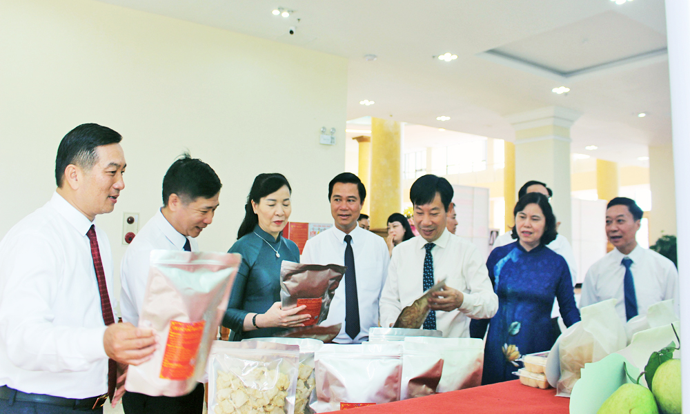 Các đại biểu tham quan gian trưng bày sản phẩm nông nghiệp tiêu biểu của tỉnh. |