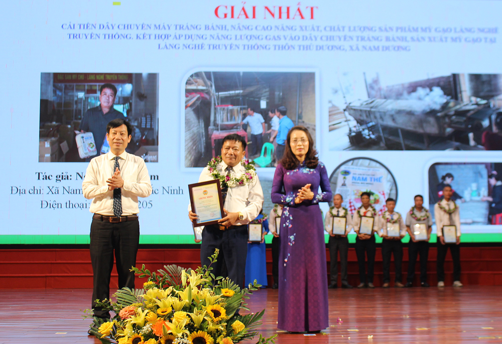 Giải Nhất thuộc về tác giả Nguyễn Văn Nam (xã Nam Dương) với giải pháp “Cải tiến dây chuyền máy tráng bánh, nâng cao năng suất, chất lượng sản phẩm mỳ gạo làng nghề truyền thống; kết hợp áp dụng năng lượng gas vào dây chuyền tráng bánh, sản xuất mỳ gạo tại làng nghề truyền thống thôn Thủ Dương, xã Nam Dương”.