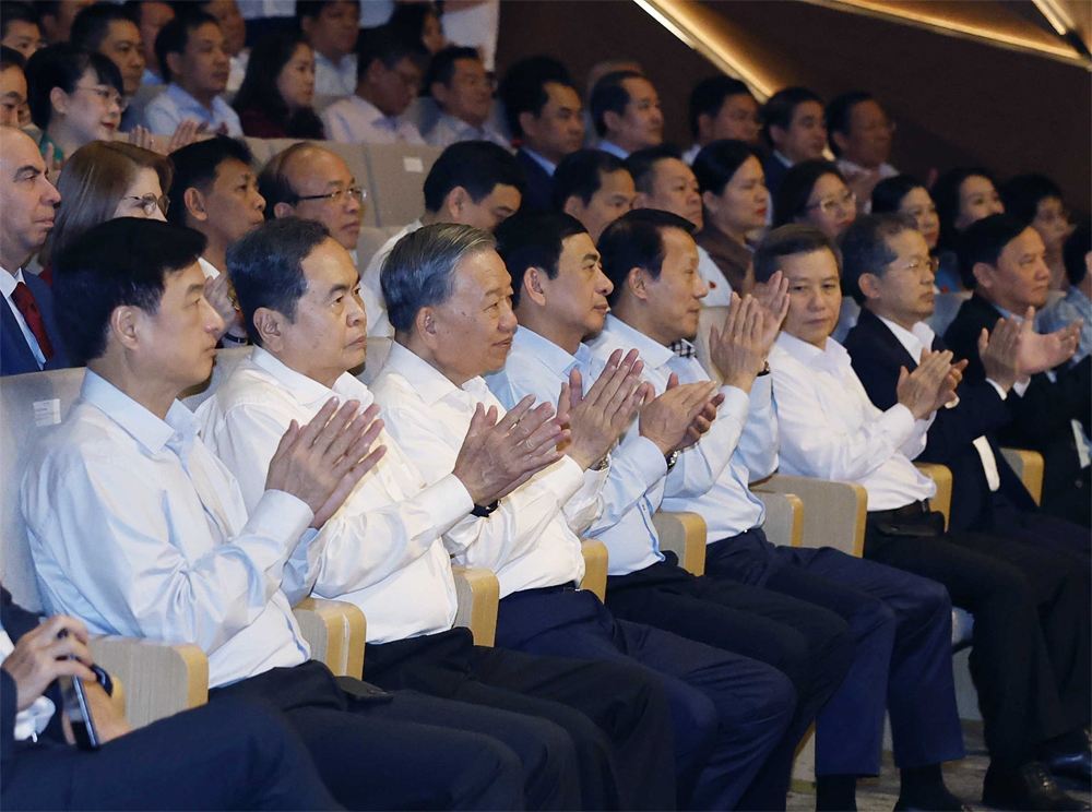 Tổng Bí thư, Chủ tịch nước Tô Lâm; Chủ tịch Quốc hội Trần Thanh Mẫn cùng các đồng chí lãnh đạo Đảng, Nhà nước dự Chương trình nghệ thuật "Tổ quốc trong tim". |