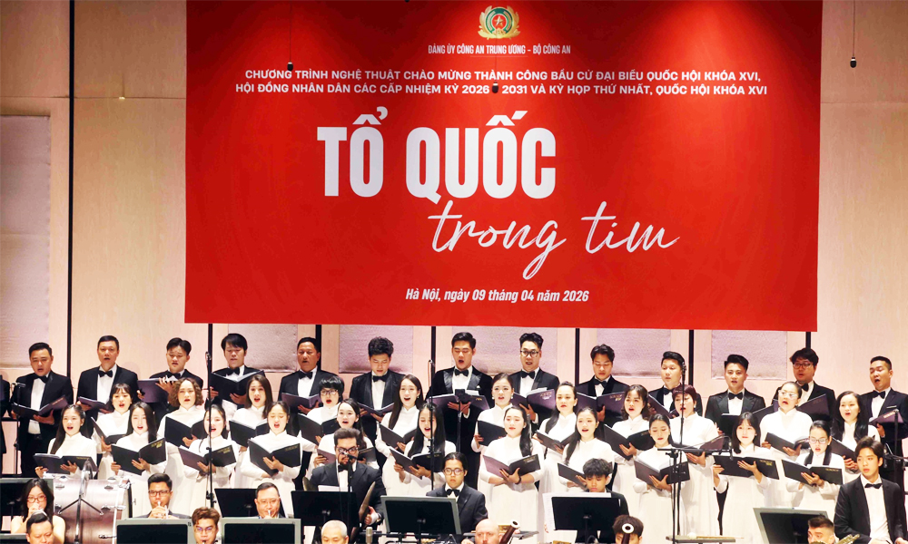 Tối 9/4, tại Nhà hát Hồ Gươm, Hà Nội, Đảng ủy Công an Trung ương, Bộ Công an chỉ đạo Cục Công tác Chính trị tổ chức Chương trình nghệ thuật đặc biệt “Tổ quốc trong tim” chào mừng thành công bầu cử đại biểu Quốc hội khóa XVI; bầu cử Hội đồng nhân dân các cấp nhiệm kỳ 2026-2031 và nhân dịp Kỳ họp thứ Nhất, Quốc hội khóa XVI.