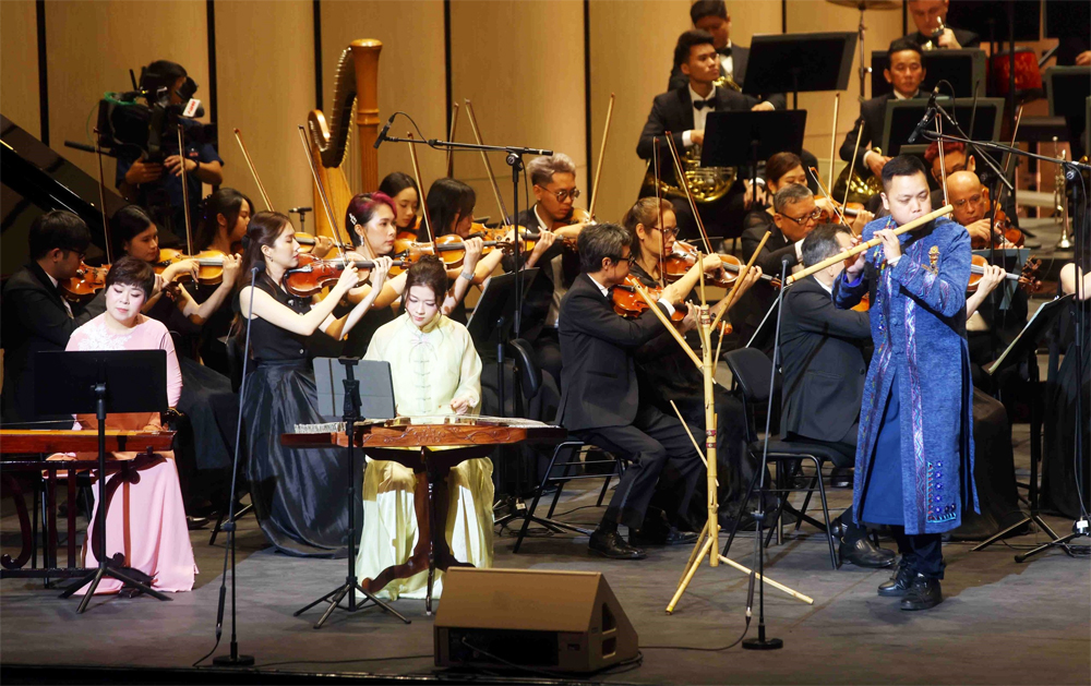 Chương trình nghệ thuật "Tổ quốc trong tim" có sự kết hợp giữa các nghệ sĩ biểu diễn nhạc cụ dân tộc và Dàn nhạc giao hưởng Hà Nội. |