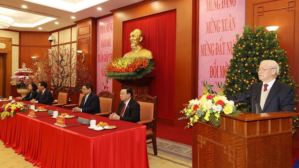 Trong không khí ấm áp đầu xuân, Tổng Bí thư Nguyễn Phú Trọng cùng các đại biểu đã thành kính dâng hương, cẩn cáo trước anh linh các bậc tiên đế, tiên hiền về những thành quả xây dựng, phát triển đất nước; cầu mong cho quốc thái dân an, nhân dân ấm no, hạnh phúc.