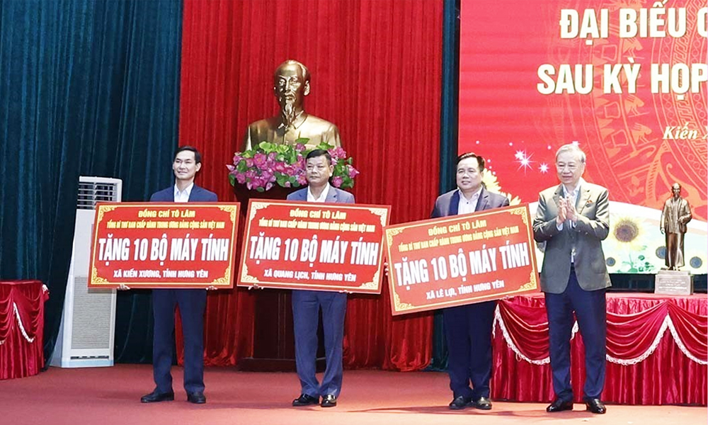 Tổng Bí thư Tô Lâm tặng máy tính cho các xã Kiến Xương, Lê Lợi và Quang Lịch (Hưng Yên). |
