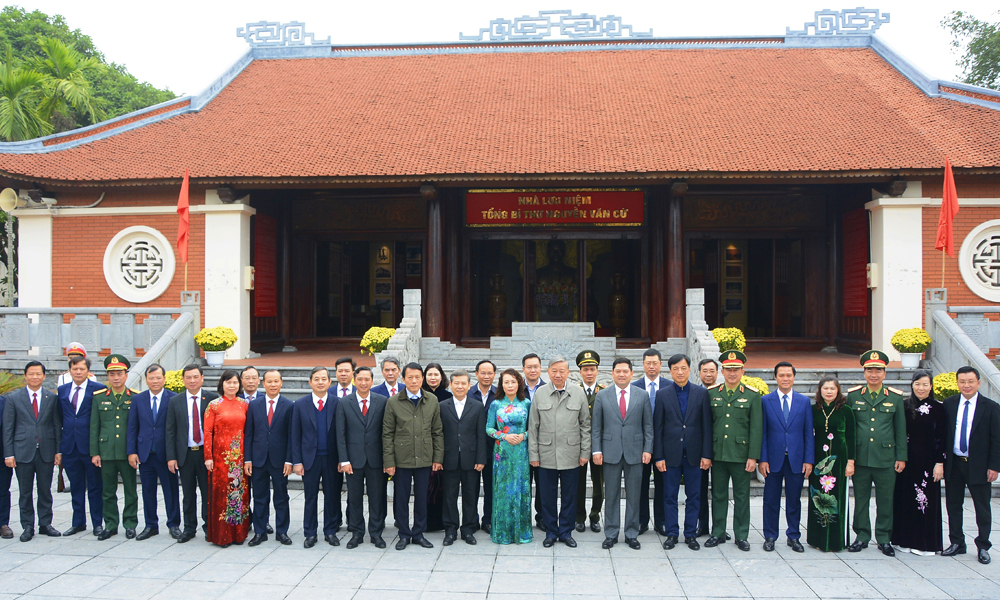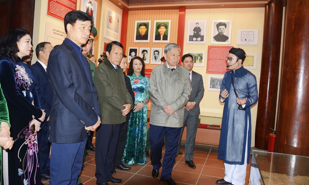 Tổng Bí thư Tô Lâm cùng các đồng chí lãnh đạo thăm Nhà lưu niệm gốc Tổng Bí thư Nguyễn Văn Cừ. |