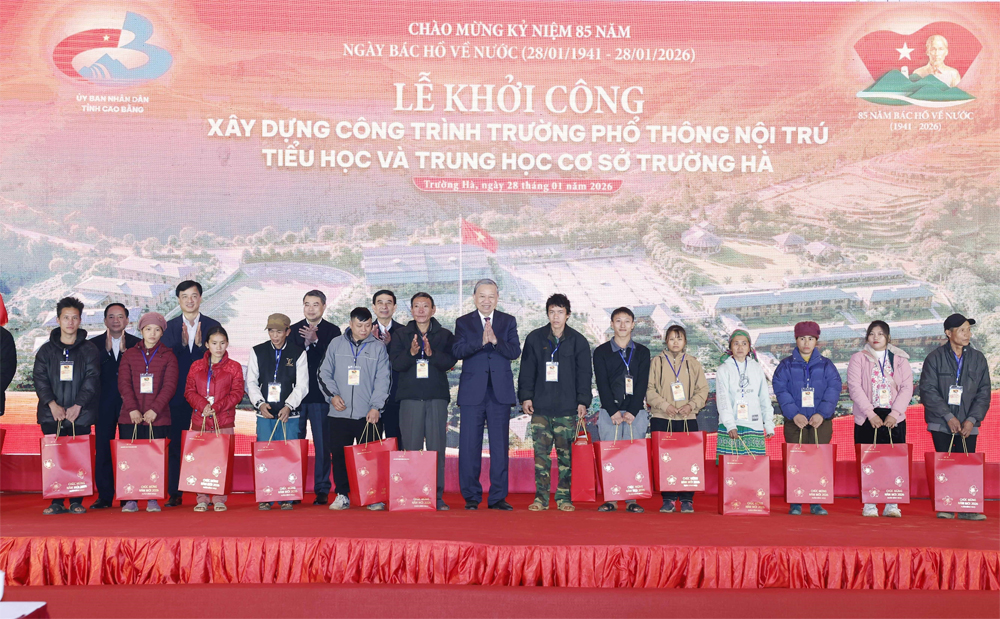 Tại Lễ khởi công, Tổng Bí thư Tô Lâm và các đồng chí lãnh đạo Đảng, Nhà nước đã trao tặng các phần quà cho hộ gia đình chính sách, người có công với cách mạng, gia đình có hoàn cảnh khó khăn trên địa bàn và thực hiện nghi thức khởi công xây dựng Trường Phổ thông nội trú Tiểu học và Trung học Cơ sở Trường Hà (xã Trường Hà, tỉnh Cao Bằng).