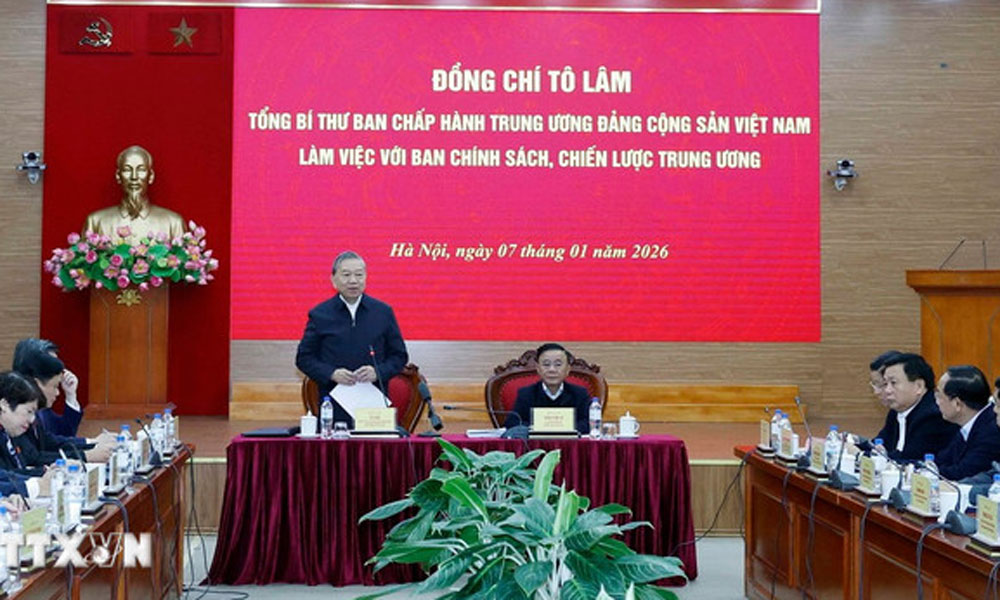 Sáng 7/1, tại Hà Nội, Tổng Bí thư Tô Lâm làm việc với Ban Chính sách, chiến lược Trung ương về định hướng xây dựng 2 nghị quyết: về đổi mới mô hình phát triển đất nước dựa trên khoa học, công nghệ, đổi mới sáng tạo và chuyển đổi số; về các giải pháp chiến lược để thúc đẩy tăng trưởng 2 con số gắn với xác lập mô hình tăng trưởng mới.