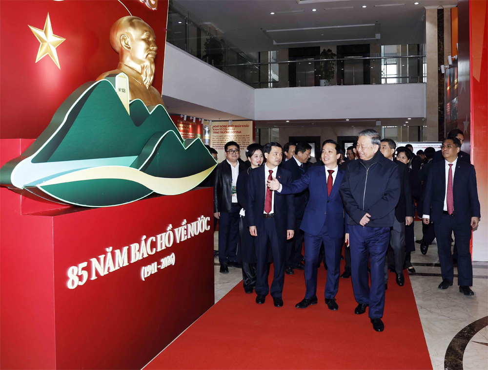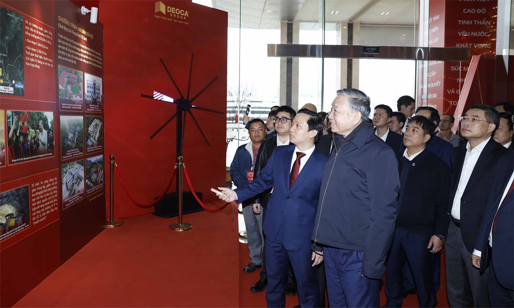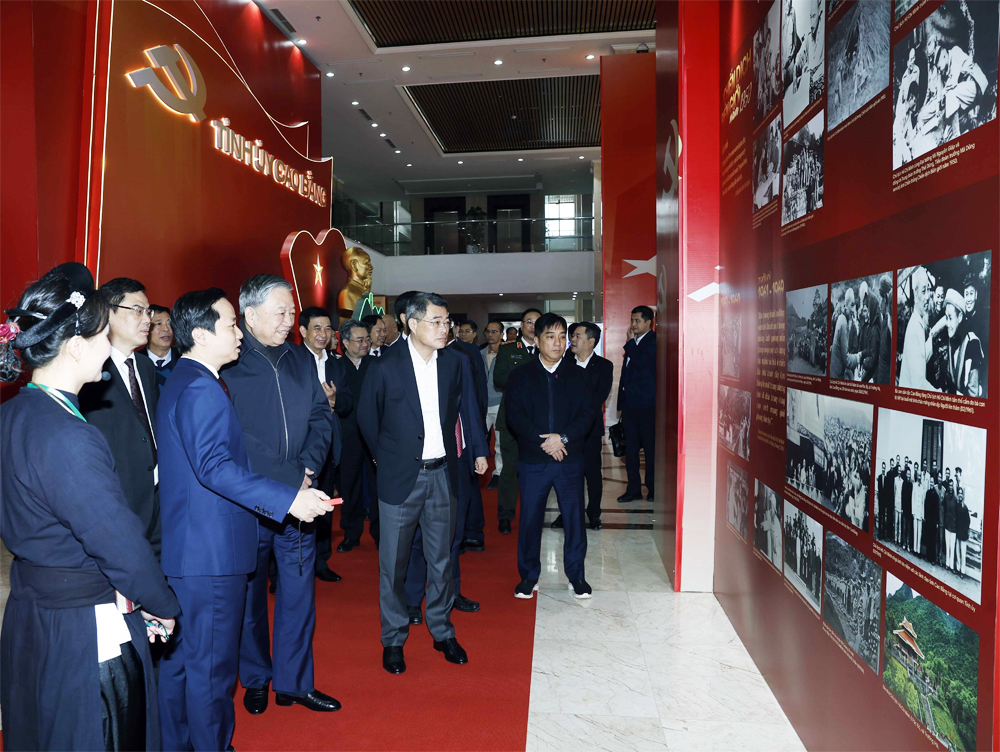 Tổng Bí thư Tô Lâm và các đại biểu tham quan không gian trưng bày ảnh về Ban Chấp hành Đảng bộ tỉnh Cao Bằng. (Ảnh: TTXVN) |