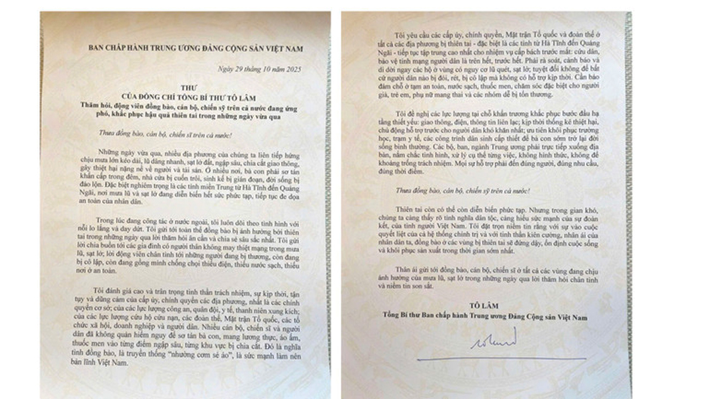 Tổng Bí thư Tô Lâm gửi Thư thăm hỏi, động viên đồng bào, cán bộ, chiến sĩ trên cả nước đang ứng phó, khắc phục hậu quả thiên tai trong những ngày vừa qua. |